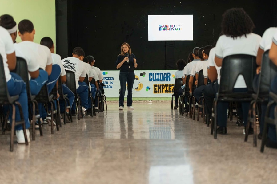 Santo Domingo, DN- Carolina Mejía, durante un conversatorio con los estudiantes del Centro Salesiano Oratorio María Auxiliadora (OMA), a través del programa La Alcaldía Llega a tu Centro Educativo, orientó a los jóvenes sobre la importancia del debido manejo de los desechos sólidos para cuidar al medio ambiente.